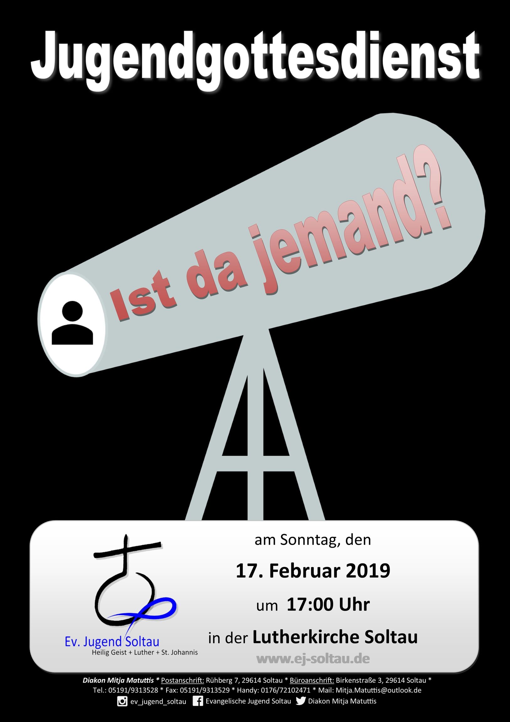 Am Sonntag, den 17. Februar 2019 lädt die Ev. Jugend Soltau zum nächsten Jugendgottesdienst ein. Um 17 Uhr soll es in der Lutherkirche losgehen.