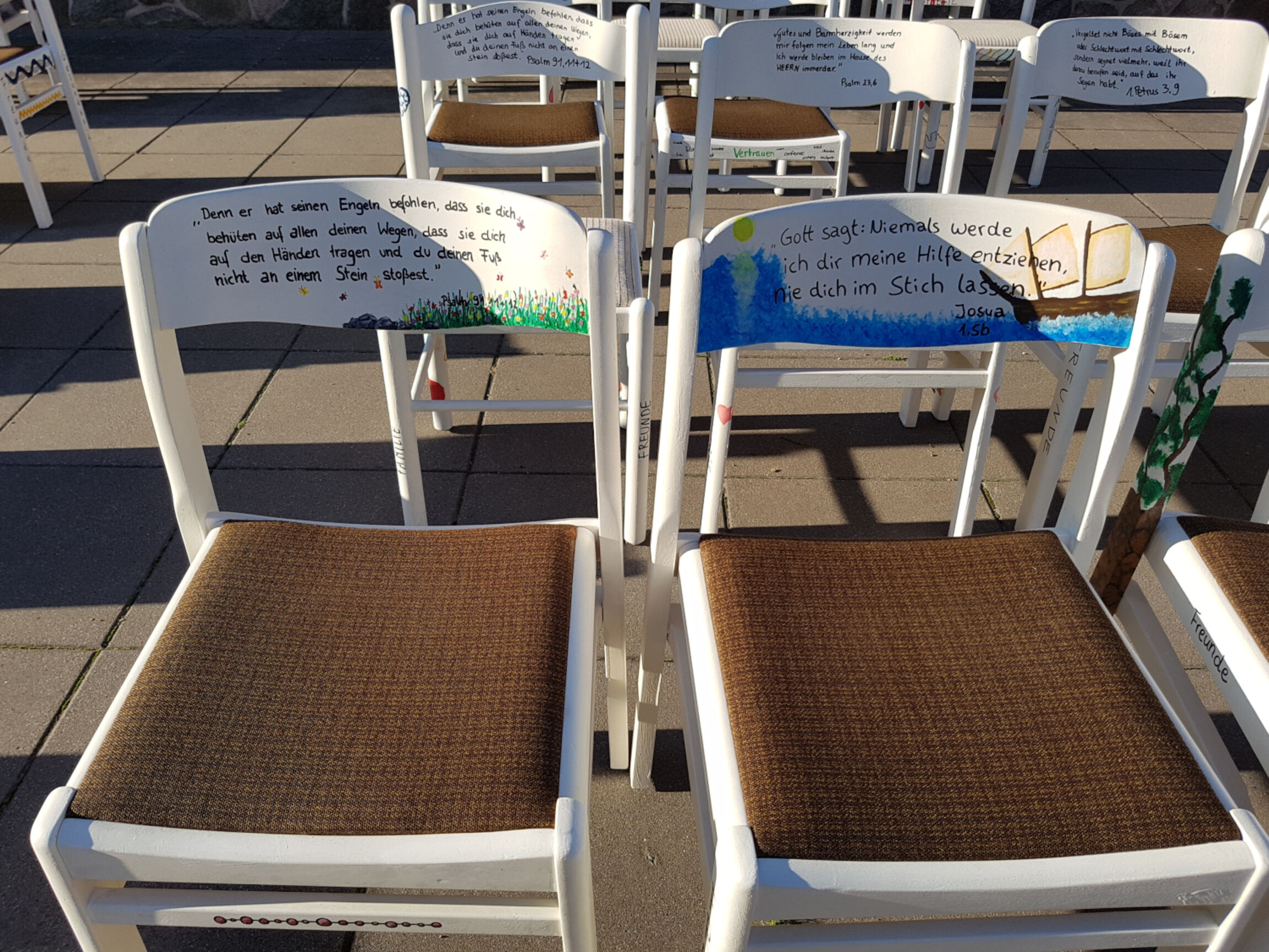 Pastorin Kathrin Burgwal und die 15 Teamer überlegten sich eine Aktion: Die Teamer schliffen bei bestem Sonnenschein auf dem Kirchplatz vier Monate lang 34 alte Stühle ab, besprühten sie mit Kreidefarbe, schrieben auf die Stuhllehnen den Konfirmationsspruch und den Namen. Denn jeder Konfirmand, jede Konfirmandin sollte bei der Konfirmation auf seinen, ihren eigenen Stuhl sitzen und ihn auch mit nach Hause nehmen.