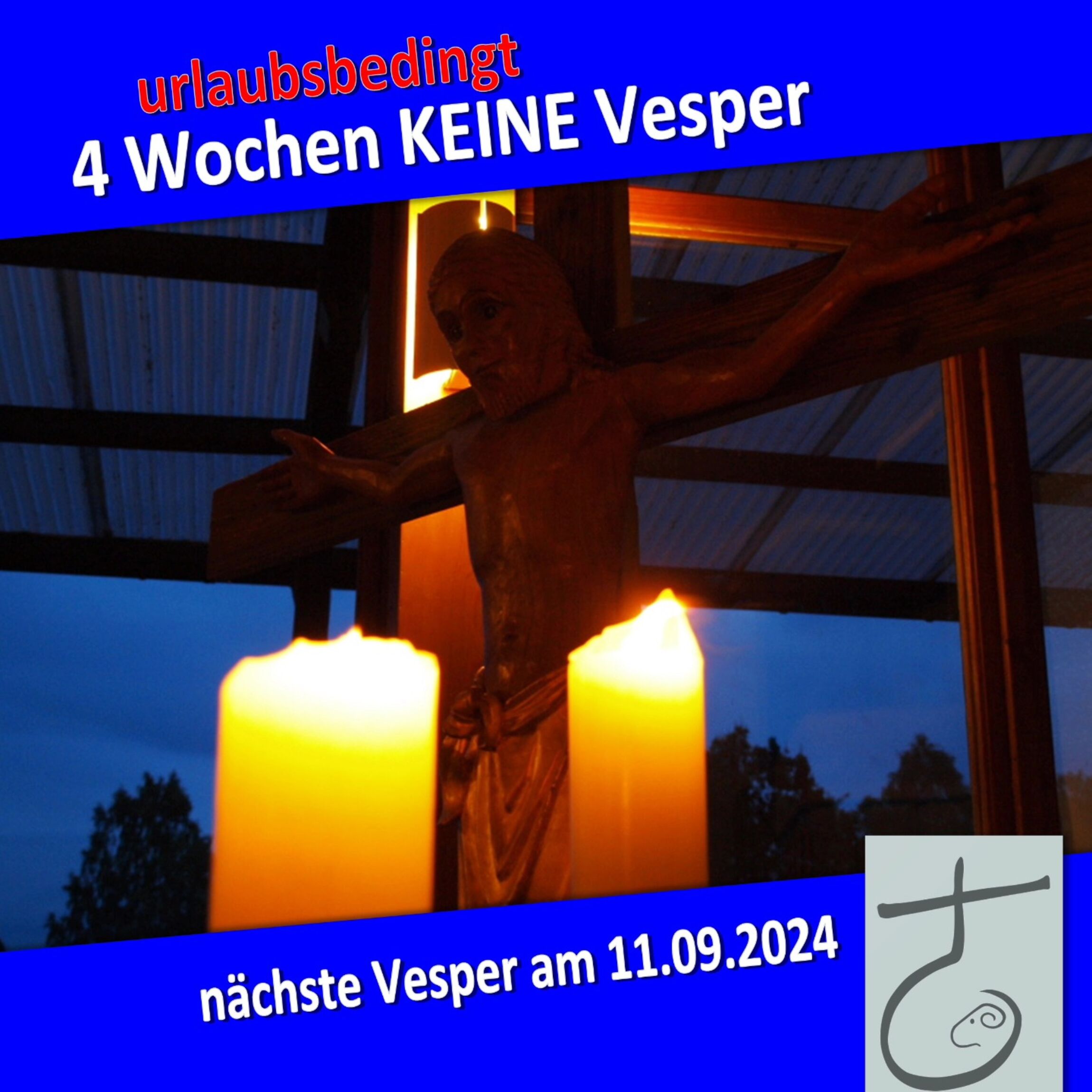 urlaubsbedingt 4 Wochen keine Vesper ACHTUNG: urlaubsbedingt kann die nächsten 4 Wochen leider keine Vesper stattfinden! Die nächste Vesper und auch der nächste Vesperkreis findet dann am 11.09.2024 statt.