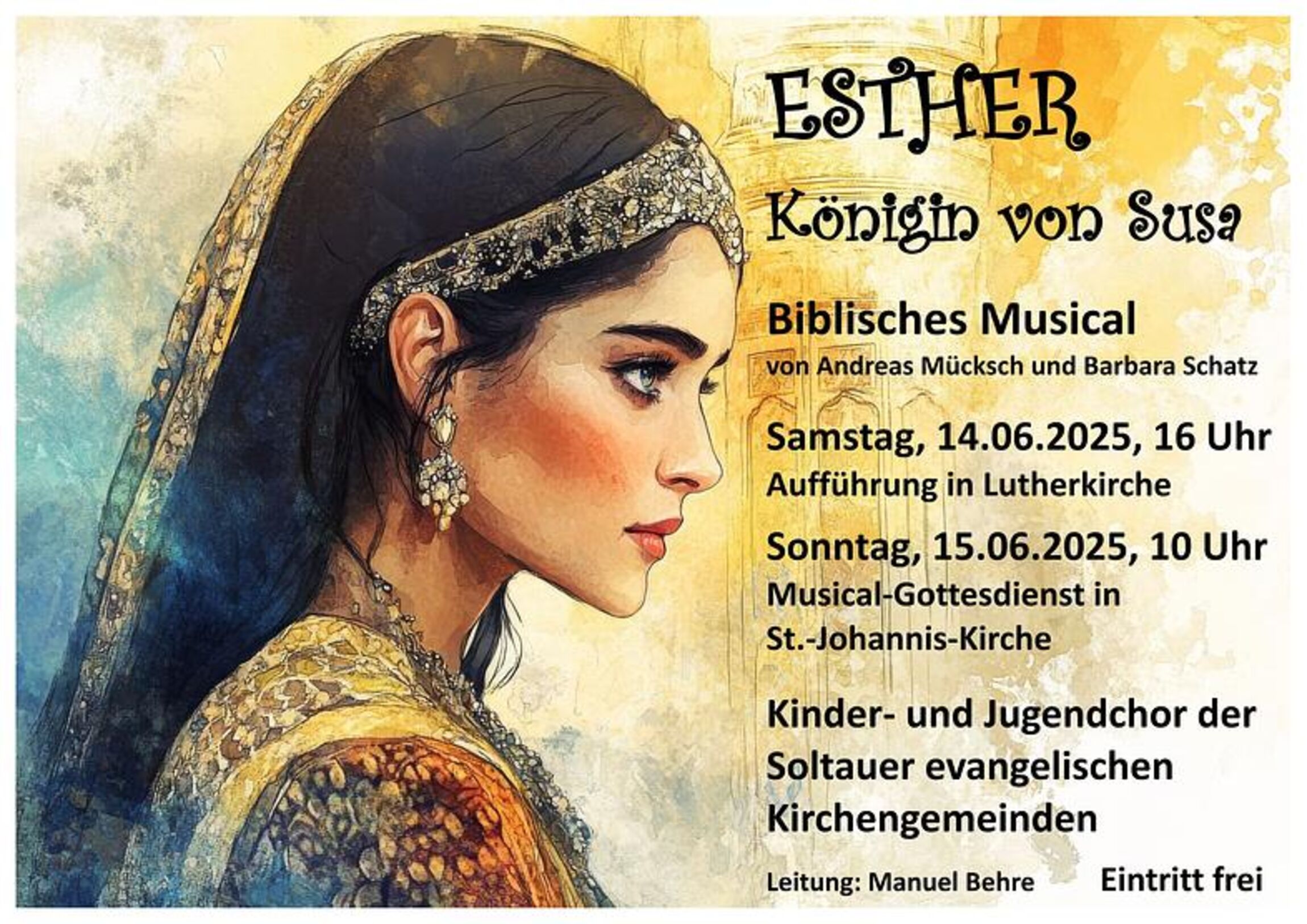 Zusammen mit einer fünfköpfigen Band und dem Jugendchor, der die Kinder sängerisch unterstützen wird, wird dieses Musical am Samstag, dem 14.06., um 16 Uhr in der Lutherkirche sowie im sonntäglichen 10-Uhr-Gottesdienst des 15.06. in der St.-Johannis-Kirche aufgeführt werden. Sie erwarten knapp anderthalb Stunden voller Spannung und Dramatik bei gleichzeitiger ausgelassener Lebens-, Spiel- und Musizierfreude, in der geheime Intrigen und hinterlistige Verschwörungen im Lichte Gottes nicht das letzte Wort haben werden. Der Eintritt ist frei. Wir würden uns sehr freuen, wenn Sie sich – am besten gemeinsam mit Ihren Freunden, Kindern und Enkeln – zu uns auf den Weg machen würden!