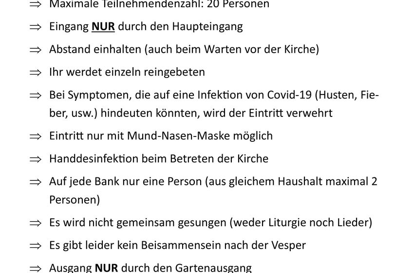 Es ist soweit und wir dürfen auch wieder die Vesper gemeinsam feiern. Allerdings zu etwas ungewohnten Bedingungen und mit anderen Formen. Wir sind sehr gespannt, wie es sein wird und freuen uns ...
